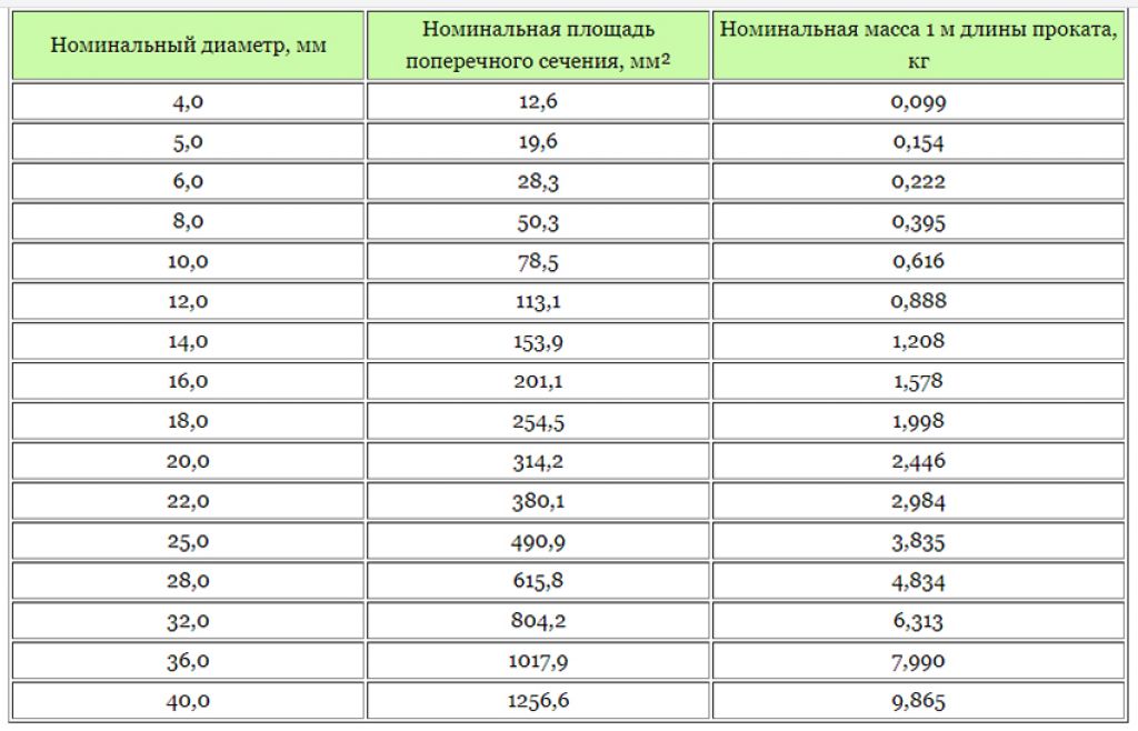 | Диаметр арматуры, мм | Марка арматуры | Вес 1 метра арматуры, кг |